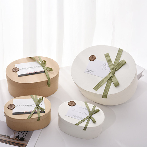Gran oferta, logotipo personalizado de tamaño, venta al por mayor, cajas de joyería de papel de anillo, cajas ovaladas baratas con cinta, caja de queso de Chocolate con forma de madera